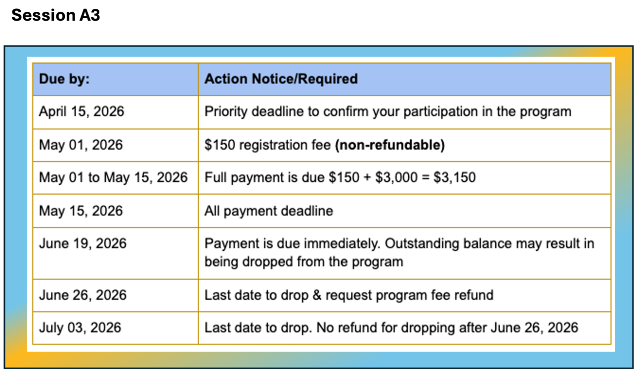All participants for this program must be a minimum of 15 years of age by the first day of Summer Sessions 2026 on June 22nd, with no exception