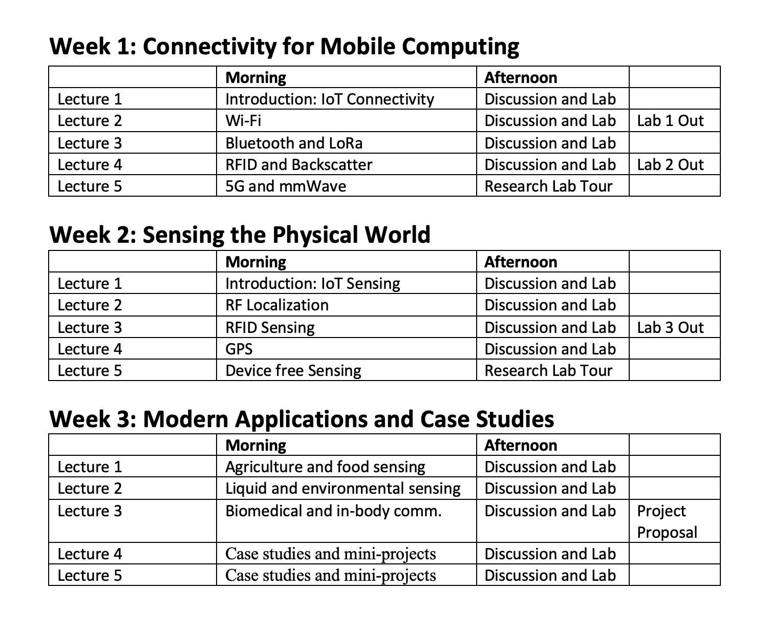 This 3-week course is designed to give students a hands-on introduction on Internet of Things (IoT) technologies focusing on connectivity and sensing aspects.